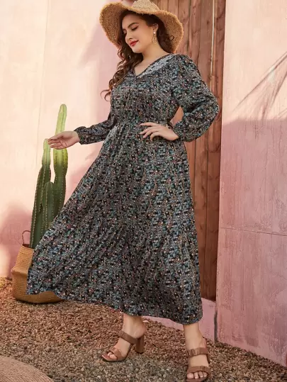 Vestido De Corte Grande Con Diseño Floral Y Aplicaciones, Mangas De Linterna Y Dobladillo Con Volantes - Multicolor - Añade 5