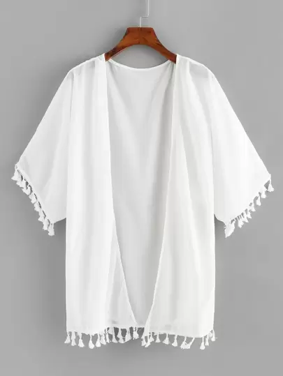SHEIN Swim Curve Kimono con dobladillo con flecos y apertura delantera, para el verano y vacaciones en la playa - Blanco - Añade 1