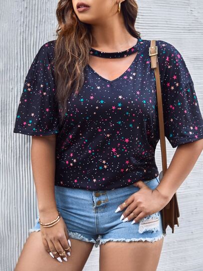 SHEIN LUNE Camiseta de hombros caídos con estampado de galaxia de cuello con abertura de ojo - Azul Marino - Añade 6