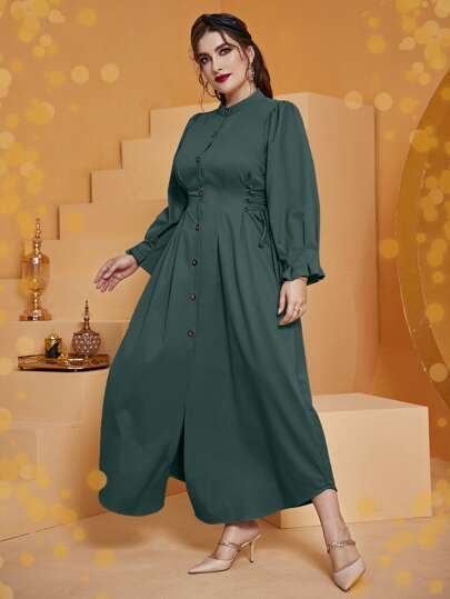 Vestido camisero con cordón lateral con botón delantero - Verde Oscuro - Añade 6