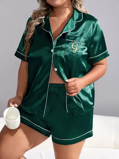 Conjunto de pijama de satén con bordado de letra y pespunte en contraste - Verde Oscuro - Añade 1