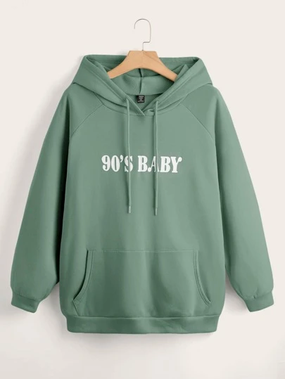 SHEIN Qutie Sudadera con bolsillo canguro y cordón con gráfico de letras talla grande - verde menta - Añade 4
