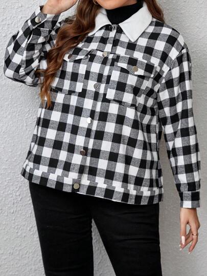 EMERY ROSE Talla grande Cazadora con estampado de cuadros cuello de borreguito con bolsillo con solapa - Blanco y Negro - Añade 1