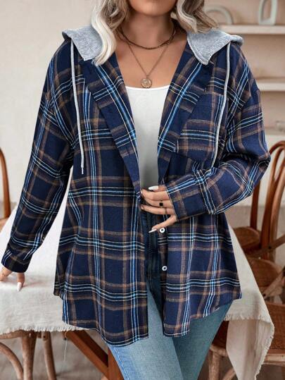 Calvaya Camisa Casual Con Cordón A Cuadros Y Capucha De Talla Grande - Azul Marino - Añade 3