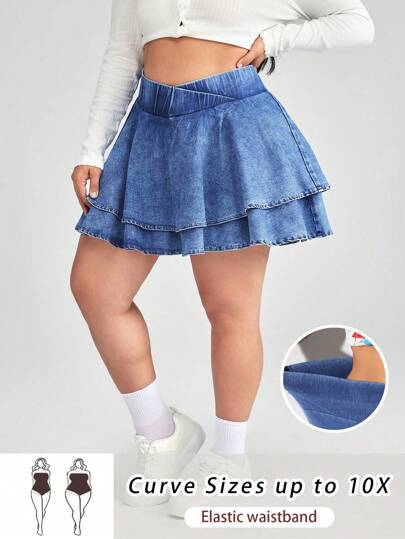SHEIN CURVE+ Falda corta vaquera en línea A, azul, para tallas grandes - Azul lavado medio - Añade 3