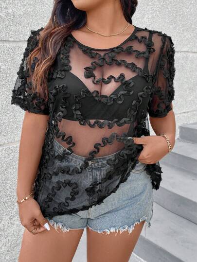 SHEIN Clasi Tamaño Grande Floral Patchwork Top De Manga Corta Con Cuello Redondo Y Ajuste Holgado - Negro - Añade 1