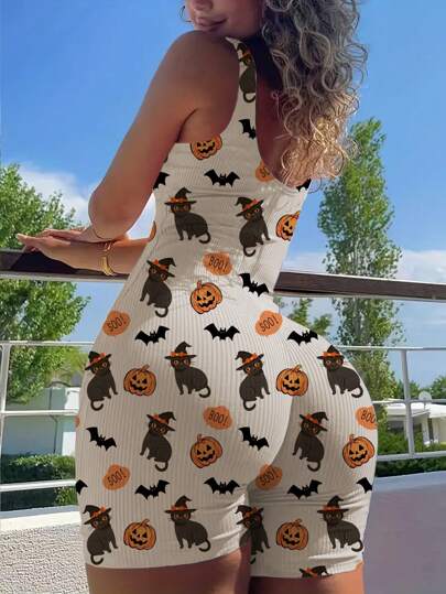INAWLY Mono de cuello redondo con estampado de dibujos animados de Halloween talla grande - Caqui - Añade 3