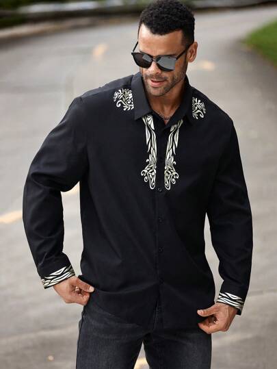 Manfinity Homme Camisa de manga larga con botones y estampado gráfico para hombre de talla grande - Negro - Añade 1