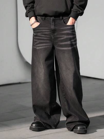 Claim Dot Jeans casuales lavados de pierna ancha talla grande para hombres - Negro - Añade 1