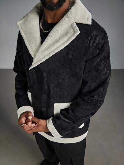 Manfinity LEGND Chaqueta de doble pecho con cuello de solapa, parches y forro polar de peluche talla grande para hombre, ropa de otoño - Blanco y Negro - Añade 1