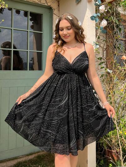 Flirla Vestido De Tirantes Con Estampado De Lunares De Talla Grande - Negro - Añade 1