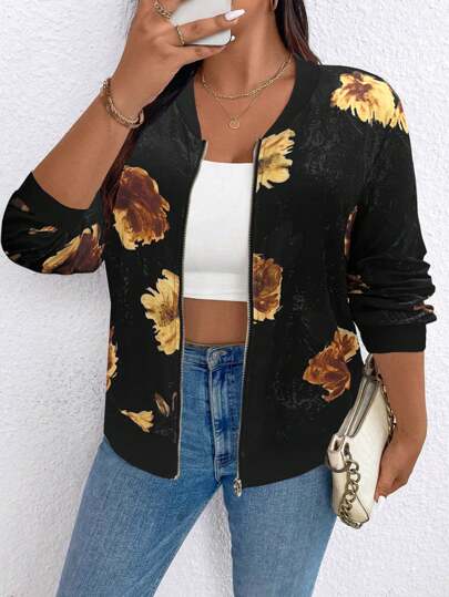SHEIN LUNE Chaqueta casual de uso diario con cremallera y estampado, talla grande - Negro - Añade 1