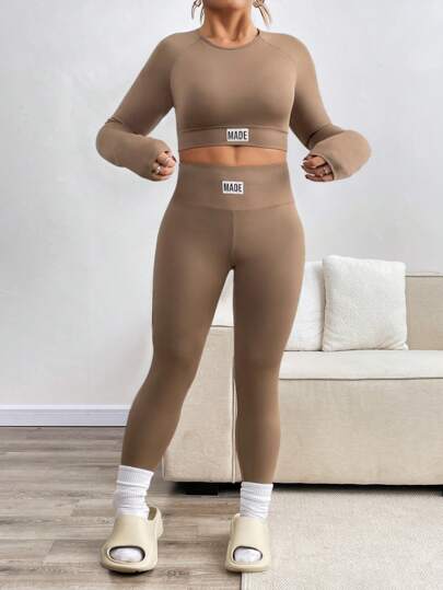 Conjunto deportivo de top de manga larga y mallas ajustadas de unicolor para tallas grandes - Café integral - Añade 2