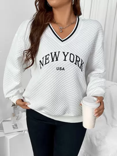 Flirla Sudadera con estampado de letra de hombros caídos guateado - Blanco - Añade 5