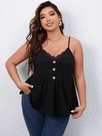 SHEIN Frenchy Top de tirantes peplum ribete con encaje con botón falso - Negro - Añade 6