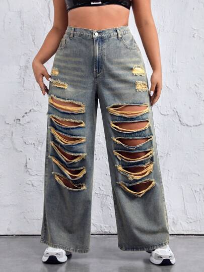 SHEIN ICON Vaqueros Holgados Desgastados De Talla Grande Para Mujer - Lavado ligero - Añade 1