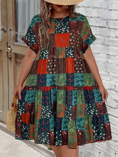 SHEIN LUNE Vestido De Muñeca De Trapo Impreso Con Remiendo Para Mujeres De Talla Grande - Multicolor - Añade 4