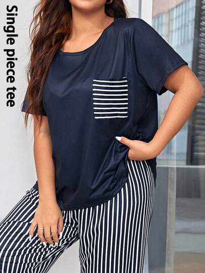 Parte superior de pijama con estampado de rayas y bolsillo aplicado, talla grande - Azul Marino - Añade 1