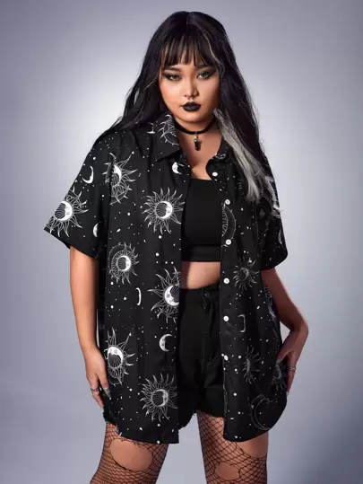 ROMWE Goth Camisa con estampado de sol y luna de hombros caídos - Negro - Añade 4