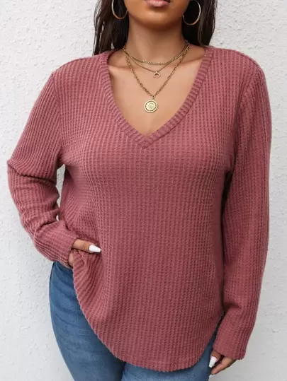 SHEIN LUNE Camiseta tejido waffle bajo curvo - Rosa vieja - Añade 5