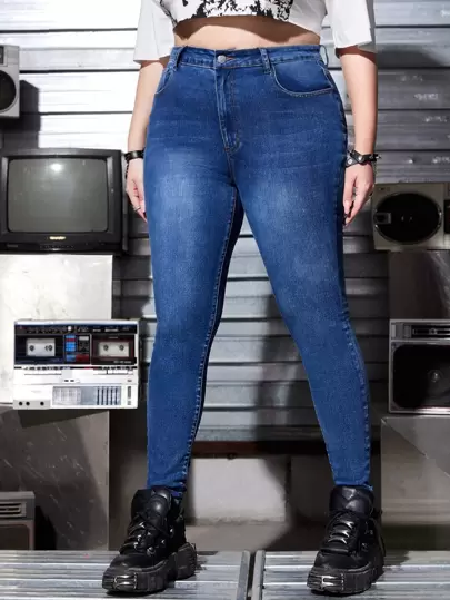 SHEIN Jeans ajustados con lavado sin cinturón - Azul lavado oscuro - Añade 1