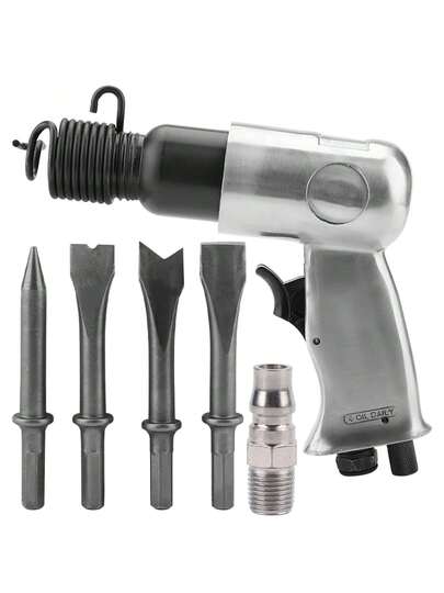 Martillo Neumático para Romper Hormigón, Kit de Martillo de Cincelado de 150 Mm con 4 Cinceles, Kit de Herramientas de Fuerza para Demolición, Mango Potente Industrial, Cincel de Aire de Tipo Recto, Martillo Neumático Industrial Cincel Recto 150mm, Entrada de aire 1/4" - Plateado - Añade 3