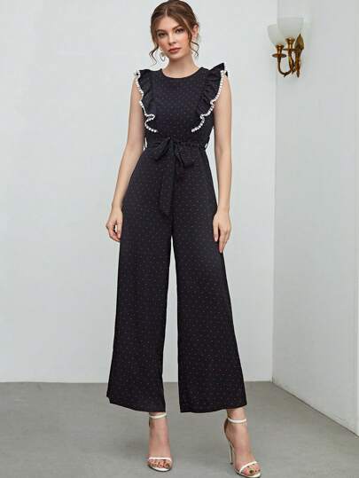 Mulvari Mono de pernera ancha con cinturón y ribete de volantes de lunares - Negro - Añade 1