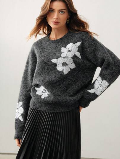 Anewsta Suéter de cuello redondo tejido con bordado floral y cuentas, diseño premium para otoño e invierno - Negro - Añade 5