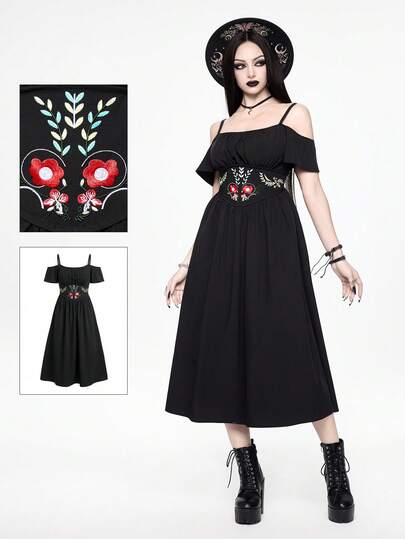 ROMWE Goth Vestido midi con hombros descubiertos y bordado gótico para mujeres - Negro - Añade 1