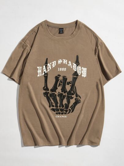 ROMWE MEN Hombres Camiseta esqueleto con estampado de mano y letra - Marrón - Añade 1
