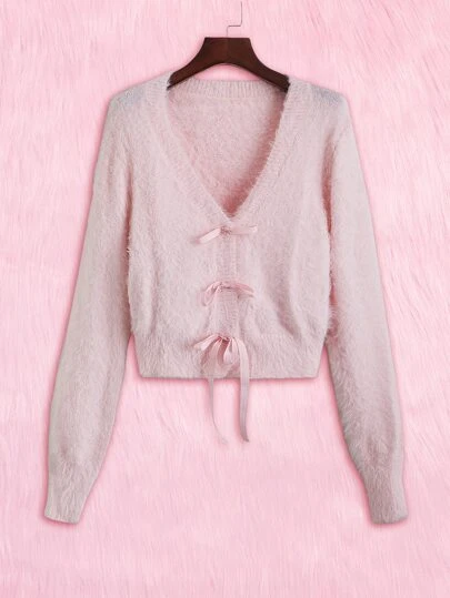 ROMWE Kawaii Cárdigan con nudo delantero de peluche - Rosa Pálido - Añade 3