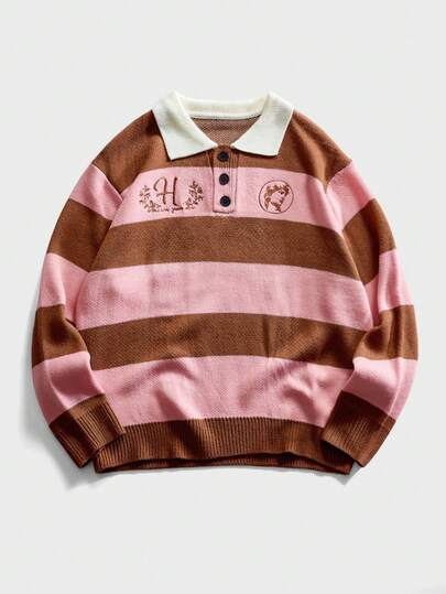 ROMWE MEN Prep Jersey de punto con cuello y bordado de rayas para hombre - Rosa - Añade 5