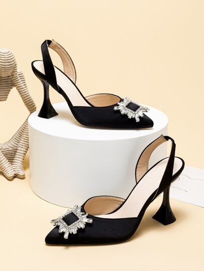 Tacones altos con puntera puntiaguda para mujer en otoño/invierno, con hebilla cuadrada de cristal y correa trasera, elegantes, para fiesta - Negro - Añade 6