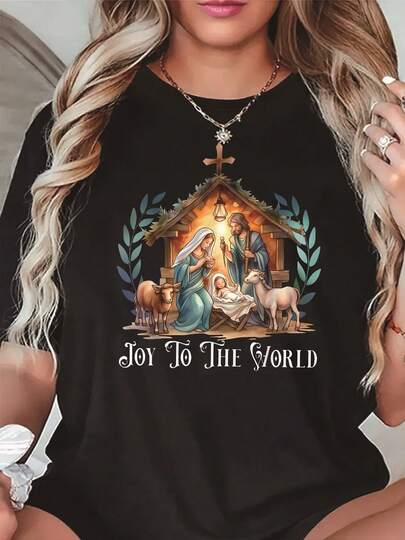 Camiseta de cuello redondo con estampado divertido de tema navideño de tarta de huevo, fibra de poliéster, lavable enáquina, adecuada para todas las estaciones, ajuste regular, sudaderas para mujeres, conjuntos deportivos, camisetas deportivas para mujeres - Negro - Añade 3