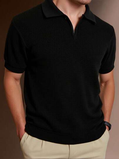RueChic Camisa polo de hombre con cierre de media cremallera y textura sólida - Gris - Añade 4