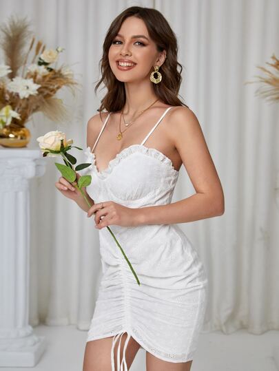SHEIN Unity Vestido de tirantes con diseño fruncido con bordado floral bajo con cordón - Blanco - Añade 5