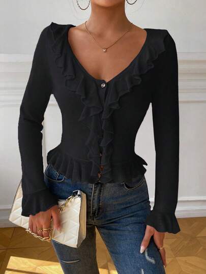 SHEIN Privé Cárdigan ribete con fruncido de manga con volante con botón delantero - Negro - Añade 5