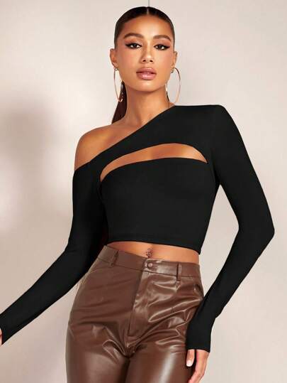 SHEIN BAE Camiseta crop de cuello asimétrico con abertura - Negro - Añade 5