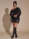 SHEIN BAE Vestido mini elegante y sexy de manga corta con cuello alto envuelto y fruncido de piel sintética negra para mujer de talla grande, atuendo de Halloween, vestido para salir, vestido de fiesta, vestido de cumpleaños para mujer