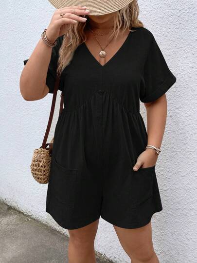 SHEIN CURVE+ Mono Con Bolsillo Y Cuello En V De Color Liso De Talla Grande - Negro - Añade 5