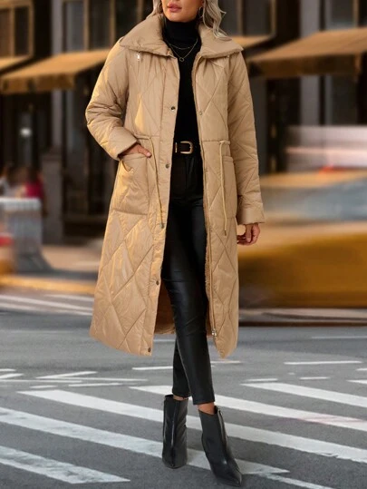 SHEIN Clasi Chaqueta acolchada con cordón y cuello alto de longitud media para mujer - Camel - Añade 6