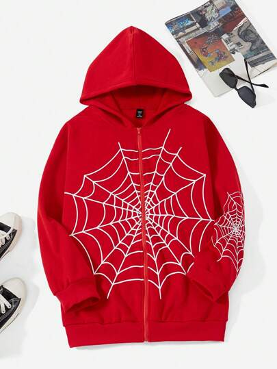 SHEIN Coolane Talla grande Cazadora Halloween con estampado de telaraña con cremallera - Rojo - Añade 5