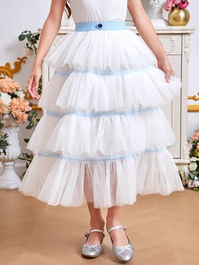 SHEIN Chicas Falda ribete con fruncido bajo a capas de malla - Blanco - Añade 4