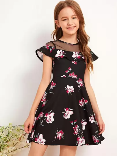 SHEIN Vestido línea A de niñas floral con malla ribete fruncido - Negro - Añade 2
