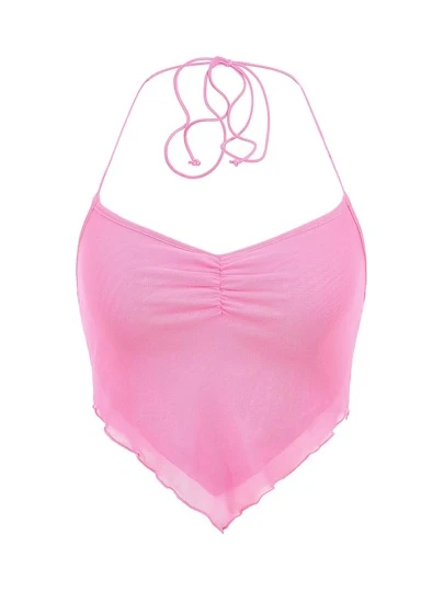 SHEIN ICON Top halter fruncido de espalda abierta con cordón bajo hanky de malla - Rosa Pálido - Añade 2