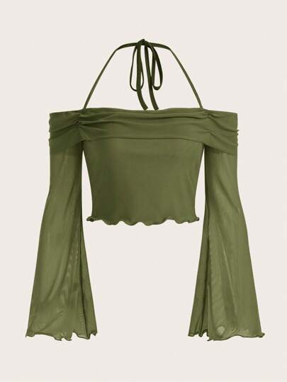 SHEIN ICON Top De Malla Con Cuello Halter Y Mangas Acampanadas De Color Liso - Verde militar - Añade 4