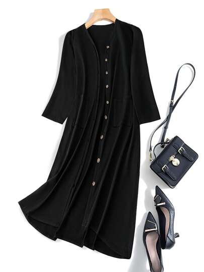SHEIN LUNE Chaqueta larga casual de manga larga con botones frontales en unicolor talla grande - Negro - Añade 3