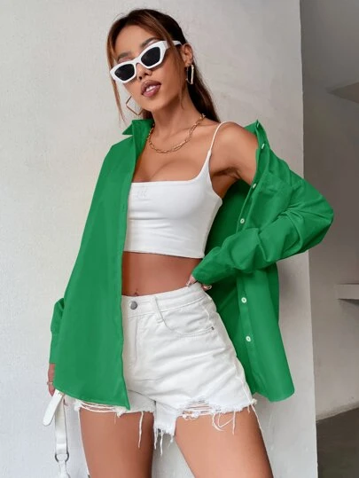 Flirla Camisa unicolor con botón delantero con parche de bolsillo - Verde - Añade 1
