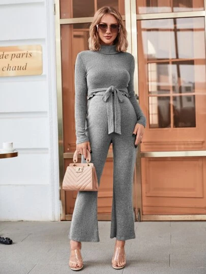 SHEIN Maternidad Set Pantalones con camiseta unicolor de cuello cisne - Gris - Añade 4