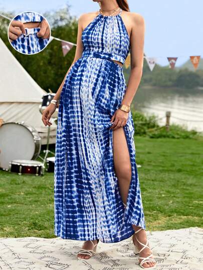 SHEIN Maternidad de tie dye con tira cruzada de espalda abierta con cordón Top halter & de muslo con abertura Falda - Azul y blanco - Añade 5